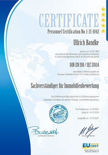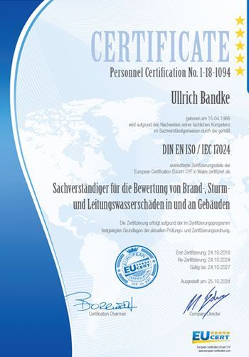 Zertifizierung DIN EN ISO/IEC 17024, Sachverständiger für die Bewertung von Brand-, Sturm- und Leitungswasserschäden in und an Gebäuden