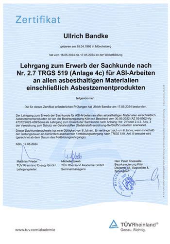 Zertifizierungsnachweis Sachkunde für Sicherheit und Gesundheitsschutz bei Arbeiten in kontaminierten Bereichen gemäß DGUV 101-004