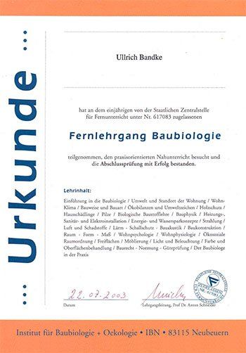 Fernlehrgang Baubiologie IBN Neubauern – Schwerpunkte: Baukonstruktion, Baustofflehre, Bauphysik, Schadstoff- und Schimmelpilzanalytik, Sanierung