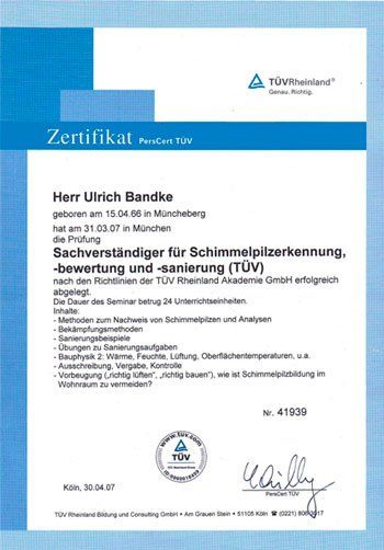 Personenzertifizierung zum Sachverständigen für Erkennung, Bewertung und Sanierung von Schimmelpilzbelastung (TÜV Rheinland)